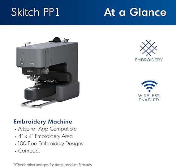 • Small footprint for all your big Ideas: The Skitch Single-Needle Embroidery Machine will fit nicely in any makeshift craft room and is always ready for your next great idea.