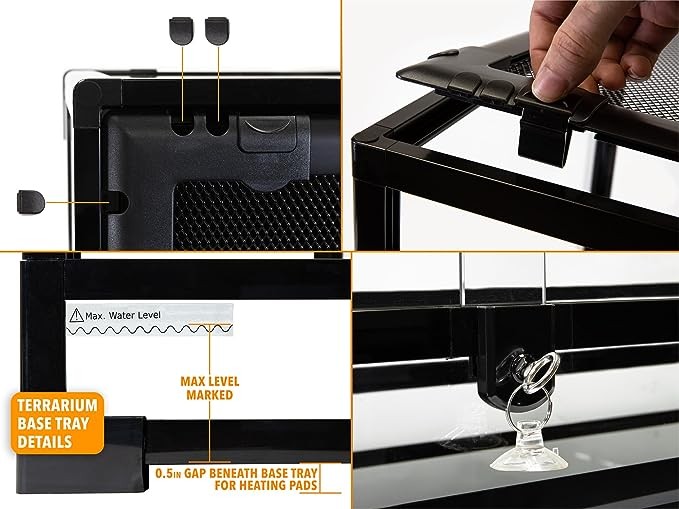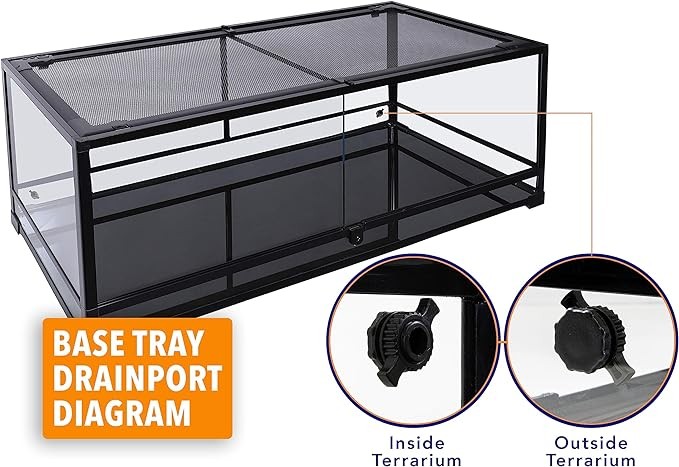 • If habitats with water are planned, we suggest a fresh bead of aquatic sealant glue around the inside joints of the base tray for additional leak protection. We also strongly recommend a leak test of the base tray after terrarium assembly in a safe area. Heavy misting inside of terrarium will require aquatic sealant glue to the interior joints of the rear and side panels after assembly; misting should avoid the front doors. Elaborate habitat installations that create significant pressure against the walls of the terrarium can affect squareness, integrity and waterproof base tray.