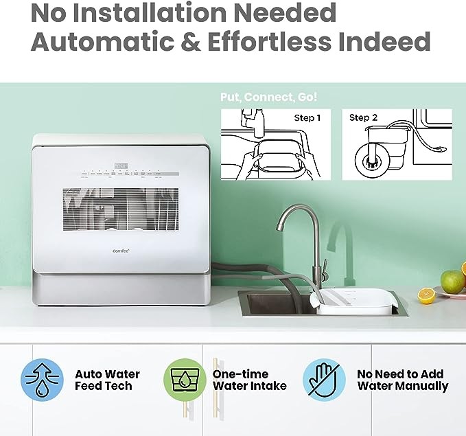 COMFEE' Portable Dishwasher, Countertop Dishwasher with 3 Place Settings, Mini Dishwasher with More Space Inside, 6 Programs, Auto-Open Drying, Touch Control, White