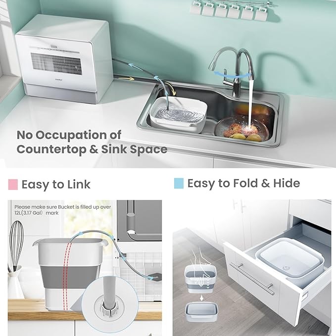 [No installation needed ]: With a portable Bucket, you can put the dishwasher in any suitable place. Besides, You can also be hooked to the kitchen faucet directly with the included water inlet.