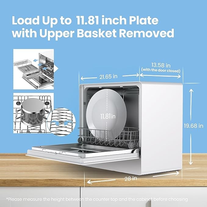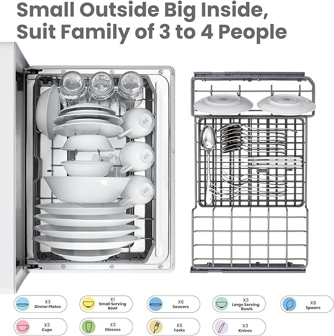 [Slim Body with 3 PlaceSettings ]: With a slimmer body, the tabletop dishwasher takes up less countertop space and is perfect for tiny kitchens. Great for families (3-4people). It's also has been considerately designed that load up to 300mm plate with the upper basket removed