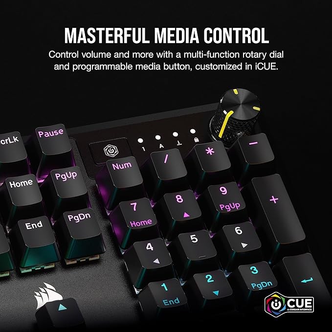 • Masterful Media Control: Control volume and more with a multi-function rotary dial and programmable media button, customizable with iCUE
