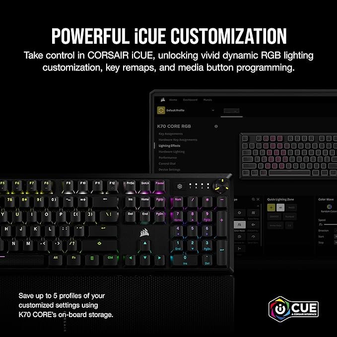 CORSAIR K70 CORE RGB Mechanical Gaming Keyboard with Palmrest - Pre-lubricated Corsair MLX Red Linear Keyswitches - Sound Dampening - Media Control Dial - iCUE Compatible - QWERTY NA Layout - Black
