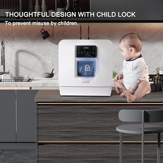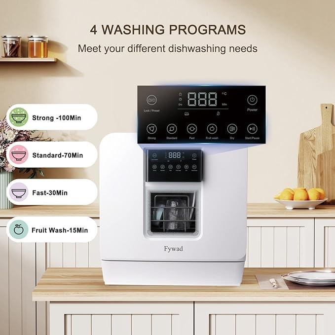 Fywad countertop dishwasher, portable dishwasher no hookup. Countertop Dishwasher with Water Tank. With child lock, hot drying, 4 washing programs. 360-degree spraying.