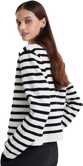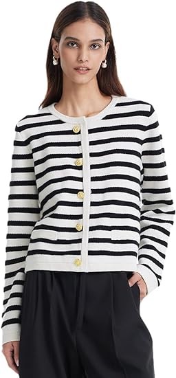 • FEATURES - This striped long sleeved wool sweater for women has moderate thickness. Its round collar and striped pattern are simple yet stylish. The decorative gold buttons add a luxurious vibe to this cardigan. In order for the buttons to stand firmly on the surface of the cardigan and not to hang down even when you wear it open, it has a hook and eye closure to act as the actual closure. Without button holes, its front is more upright and shapely.