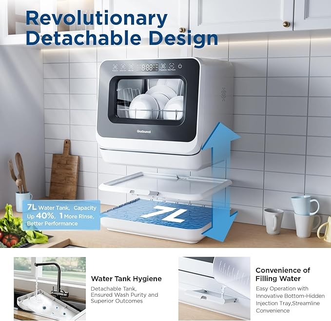 • 【Revolutionary Detachable Design】Our portable countertop dishwasher features a detachable 7L water tank, which is 40% larger than traditional portable dishwasher. It serves 1 more rinse cycle and contributes a 100% improvement in cleaning performance. Plus, the removable water tank ensures cleanliness inside and out, enhancing its cleaning capabilities. The innovative bottom water intake adds to the convenience of operation.