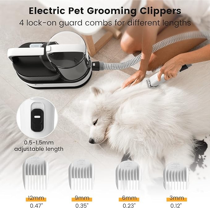 • ?【Vacuum Suction 99% Pet Hair】Are you annoyed at the messy scene caused by the traditional dog clipper? Our dog hair vacuum groomer have a vacuum function, which can collect 99.5% of pet hair into a vacuum container. When cleaning pet hair, the loose hair removed will be directly sucked into the vacuum cleaner, so that no more hair will be left on the clothes, nor will there be piles of hair scattered in the home, which will not be messy, can avoid allergies, and keep the home clean