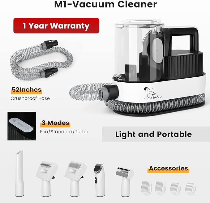 • ?【Low Noise Design】Pet vacuum cleaner has 3 suction speeds and low noise design, making pets feel comfortable and no longer afraid of haircuts. We suggest grooming your pet with brush before trimming pet hair, give the pet some snacks, and use it from the first gear to avoid pet tension due to the noise of the vacuum cleaner. Extension hose is long enough (59 inch) to keep the vacuum away from the pet, reduce the pet's pressure and discomfort, which makes the grooming experience more pleasant
