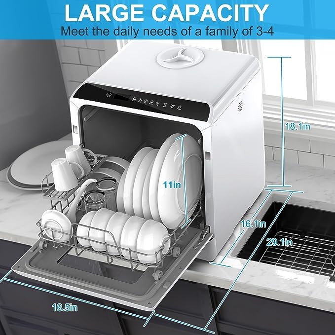 • Compact & Large Capacity: The size of the compact dishwasher is 16.7"D x 16.9"W x 18"H Inches. You can put it on any table or shelf. After putting in the dishes of a family of three, you can enjoy parent-child time more. It is a tabletop dishwasher, dryer, and cabinet.