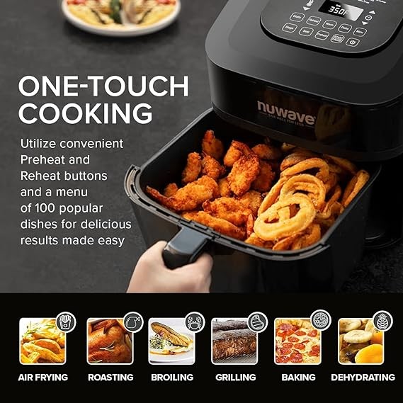 NUWAVE Brio 8-Qt Air Fryer, Powerful 1800W, Easy-to-Read Cool White Display, 50°-400°F Temp Controls, 100 Pre-Programmed Presets & 50 Memory Slots, Integrated Smart Thermometer, Linear T Technology