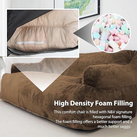 N&V Giant Twin Size Bean Bag Sofa, Foam Filling Floor Sofa, Includes Removable and Machine Washable Cover (Brown)