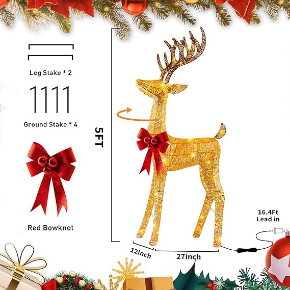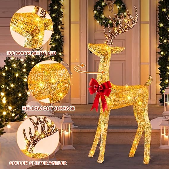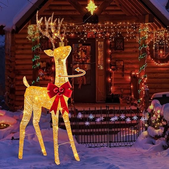 • 【Reindeer Outdoor Decorations】 Covered with champagne gold glitter, this 5Ft reindeer decor features dynamic head and neck, automatically moving left and right. Total 100 warm white LED will glow charming and beautiful light in the dark. Also can be placed anywhere with its 16.4Ft power cord