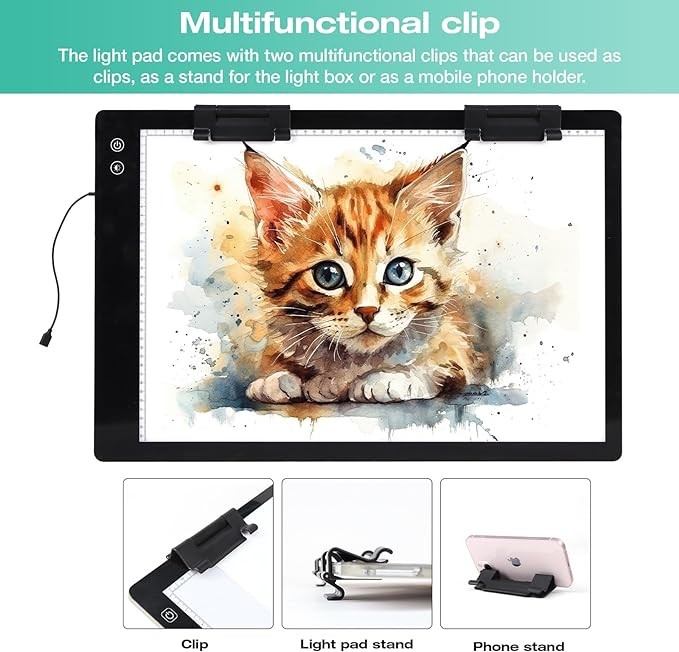 • Tracing Light Pad Usage Scenarios: Drawing light box can be used for diamond painting, weeding vinyl, 2D animation, calligraphy, scrapbooking, tattoo transfer, sketching and painting, streaming, sewing projects, stained glass, quilting and more. It is not only the perfect tool to assist in improving painting skills, but also an ideal gift for children's day, father's day, birthdays, etc.