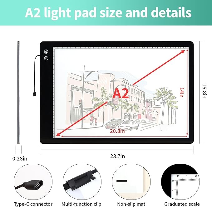 • Rechargeable Light Pad: A2 light pad is available with both built-in battery power and USB power supply, with a built-in 5200mAh battery for use in places without a power supply. Equipped with C-port for easy charging, works for approx 3 hours at MAX brightness after fully charged(Fully charged in 4 hours)