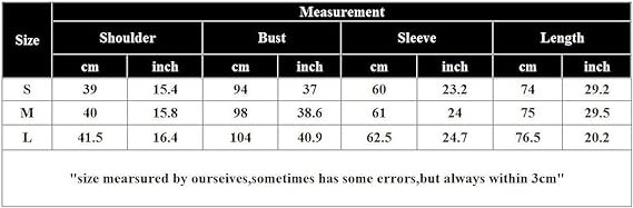 • SIZE-M:Bust:39inch,Shoulder:15inch,Sleeve:22.5inch,Length:29.5inch