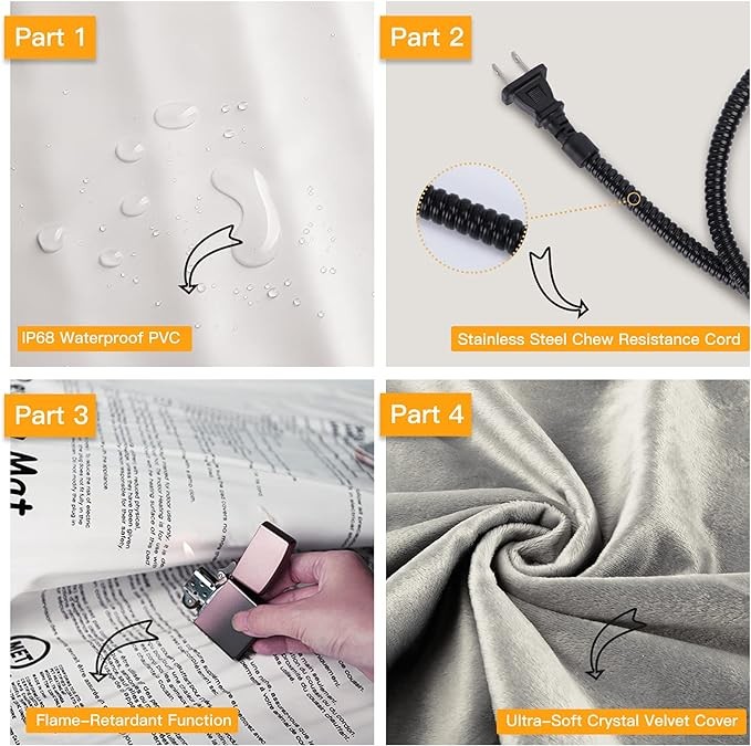 • ❤【Safety and Secure Structure】7-layer protective structure with UL-certified heating wire protect pets from burns. Soft PVC envelope with waterproof and flame-retardant function. Built-in intelligent temperature sensor in the heating pad to prevent overheating to protect pets. Don’t let your pets lay on the pet heating pad without a plush cover.