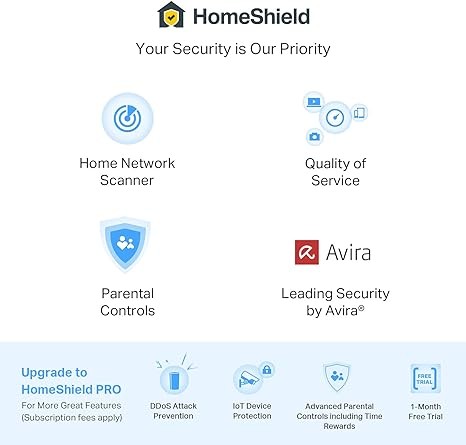 • TP-Link HomeShield - TP-Link's premium security service keeps your home network safe with cutting-edge network and IoT protection. Free features: 1. Basic Network Security including Security Scan and IoT Device Identification 2. Basic Parental Controls 3. Quality of Service 4. Basic Weekly/Monthly Reports. Visit TP-Link website for more information.