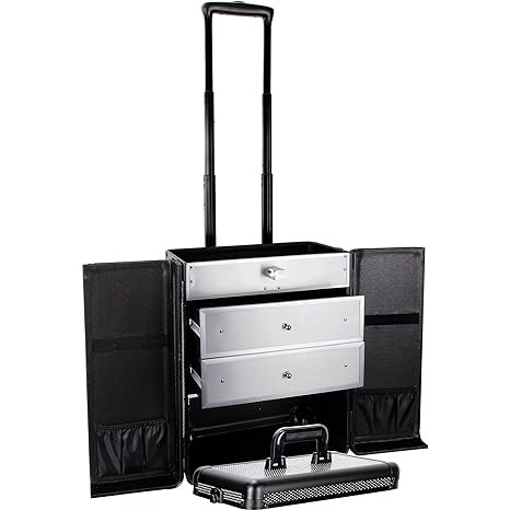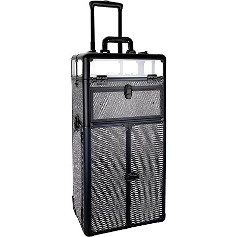 ROLLING DISPLAY & STORAGE ORGANIZER - Professional makeup artist rolling organizer case with wide opening top compartment for easy access; Inline wheels system providing smooth rolling; Designed for carrying, displaying, and traveling with cosmetics; Perfect for professional makeup artist, manicurists, beauticians, tattoo artist, hairdressers, youtubers, styling designers and beauty lovers, widely used in different occasions