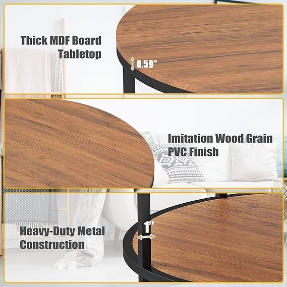 Imitation Wood Grain Surface---The distressed wood grain PVC veneer finish has the look of being weathered and old, giving it texture and a rustic, homey appeal for our coffee table. Also, this round table is scratch-resistant, waterproof and easy to clean. No paint was needed, green non-toxic and Eco-friendly.