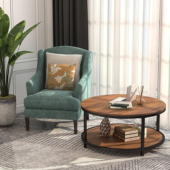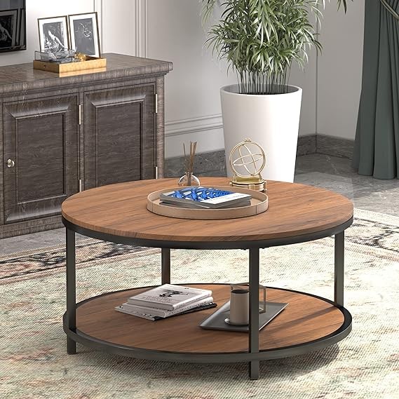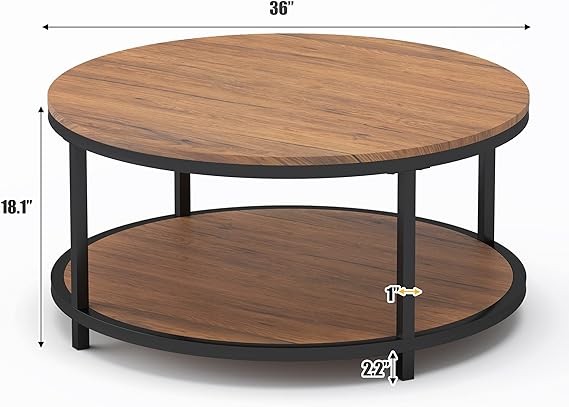 Rustic Urban Industrial Style---The warm tone of the wood and the simple modern look, gives to the tables an elegant classical vintage style, create an attractive look and feel. You can use this coffee table set in the living room, lounge, playroom.. etc., it can match wherever you put it. The Overall Dimensions for our small rustic circular coffee table are 35.83”(W) x 18.31”(H), ideal for small spaces.